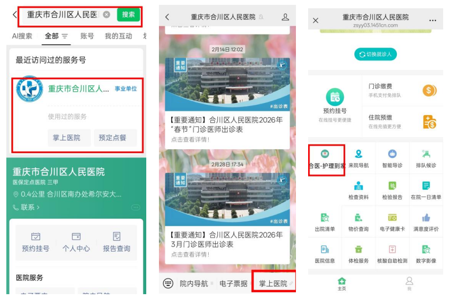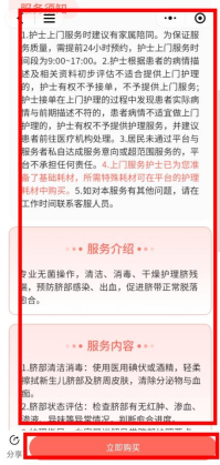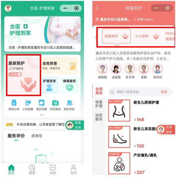 服务对象 须经医院机构医生进行评估后诊断明确、病情稳定、具备居家护理安全环境和条件的慢性疾病人群,重点服务高龄或失能老年人、康复期患者等行动不便人群或母婴人群,以及其他有居家护理需求的特殊人群。 服务项目 妇幼护理类:新生儿脐部护理、新生儿采足跟血、产后催乳/通乳、新生儿沐浴、新生儿黄疸测量、小儿推拿、小儿捏脊、会阴擦洗、阴道上药等。 导管护理类:输液港护理、PICC护理、PICC拔管、留置/更换胃管、留置/更换导尿管、气管切开护理、腹膜透析外接短管 出口处护理等。 伤口造口护理类:压力性损伤护理、伤口护理、造口/造瘘护理。 中医及康复护理类:隔物灸治疗、艾条灸治疗、耳穴压丸治疗、刮痧、日常生活动作训练(轻度、中度)、吞咽功能障碍训练、言语训练、轮椅功能训练、肺通气功能检查、运动疗法(呼吸训练)。 专科评估类:老年能力综合评估。 服务区域 与重庆市合川区人民医院路线距离10公里内 服务时间 每天9:00-17:00 服务流程 1.关注:关注重庆市合川区人民医院官方微信公众号; 2.线上预约:点击“掌上医院”进入“合医-护理到家”,选择所需项目,完善相关信息; 3.评估确认:护士提前电话沟通,评估患者情况; 4.上门服务:约定时间,护士携带规范护理物资上门提供服务,服务完成后可在线评价反馈。 操作流程 步骤一: 方法1:微信搜索“重庆市合川区人民医院”公众号,点击进入掌上医院,选择“合医-护理到家”。 方法2:微信扫码进入 重庆市合川区人民医院“合医-护理到家”小程序。 步骤二: 根据需求选择服务项目。 步骤三: 仔细阅读服务须知、服务介绍、服务内容等,后点击“立即购买”。 步骤四: 阅读《知情同意书》及《服务协议》后签名。 步骤五: 选择被服务人员、服务地址、服务时间,提交订单。 步骤六: 确认支付,购买成功。 合医-护理到家,用心守护每一个家庭的健康。